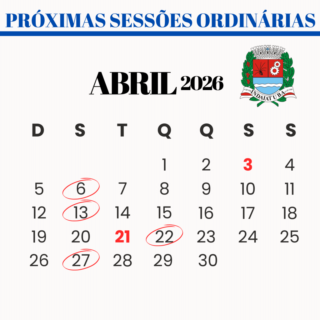 As sessões ordinárias do mês de abril serão nos dias 6, 13, 22 e 27. A sessão do dia 22 será excepcionalmente em uma quarta-feira por causa do feriado no dia 21 (Tiradentes).