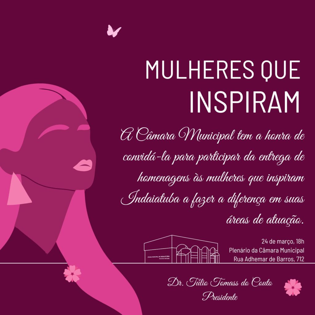 O mês de março será marcado por uma programação especial na Câmara Municipal de Indaiatuba em celebração às mulheres. As atividades integram o projeto Mulheres que Inspiram, instituído por resolução aprovada no ano passado, de autoria do presidente da Casa, Dr. Túlio Tomass do Couto, e da vereadora Clélia Santos, segunda-secretária da Casa.