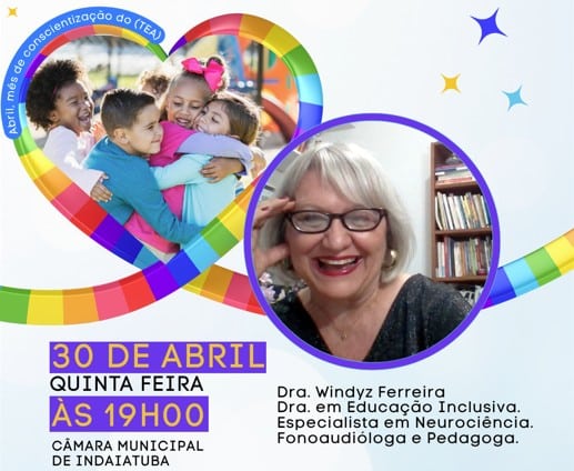 A Câmara de Indaiatuba recebe, na próxima quinta-feira (30), às 19h, a palestra “O que a neurociência diz sobre crenças e realidade no TEA”, ministrada pela professora Windyz Ferreira, doutora em Educação Inclusiva e especialista em neurociência. A atividade encerra o Abril Azul – mês de conscientização sobre as neurodivergências – instituído por lei municipal de iniciativa do vereador Hélio Ribeiro.
